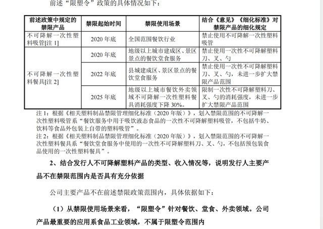 对此,公司曾正在问询函里暗示,从禁限利用场景来看,“限塑令”针对餐饮、堂食、外卖范畴。公司产物最主要的使用系食物工业范畴,不属于限塑令范畴内。