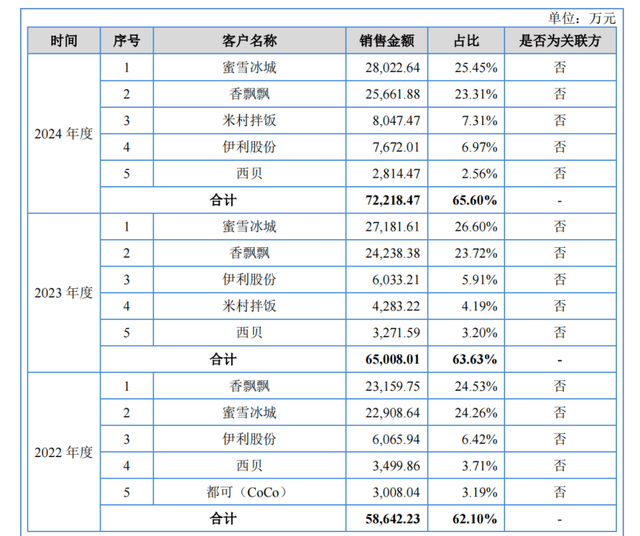不外,新天力的客户布局呈现出高度集中化特征。2022年至2024年间,公司前两大客户,蜜雪冰城和喷鼻飘飘的合计发卖占比一直维持正在近50%摆布,构成了“半壁山河依赖两家”的场合排场。